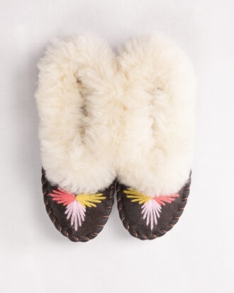 Children’s shoes carefully sewn from sheepskin. Durable on the outside and warm on the inside from the sheep’s wool. The