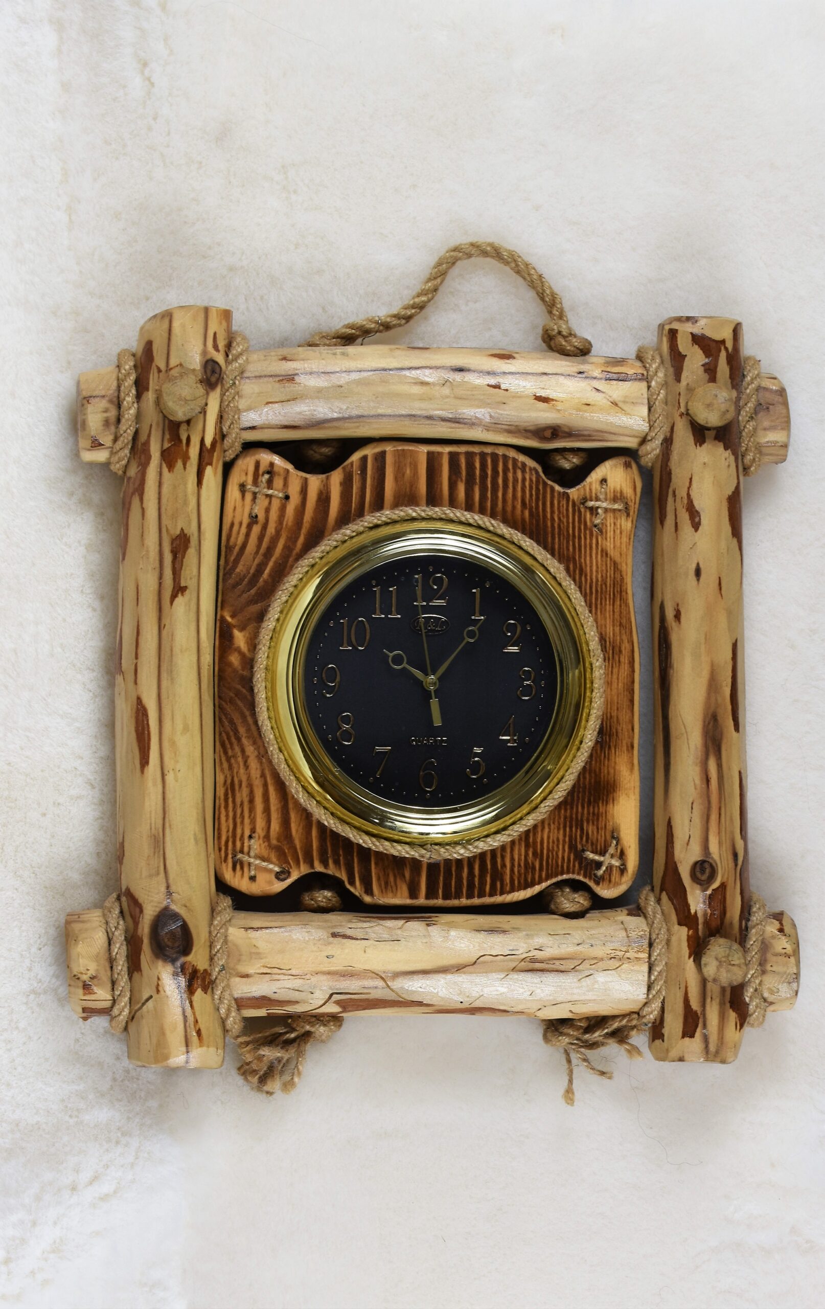 A stylish clock handmade from wood and string. The mechanism itself is electronic with AA batteries.