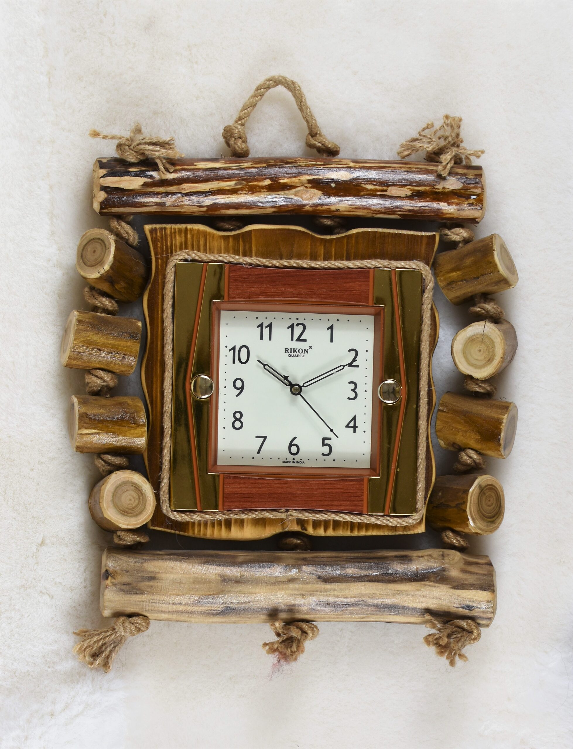 A stylish clock handmade from wood and string. Stylowy zegar wykonany ręcznie z drewna i sznura.